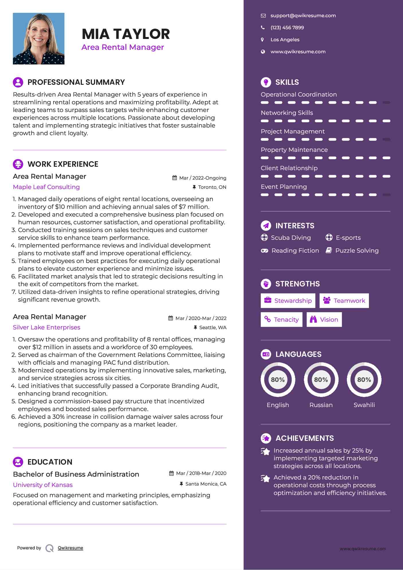 An Area Rental Manager is responsible for the direct management and overseeing of an assigned commercial and residential property for a given area or region. The job description entails maximizing asset value, customer satisfaction, and revenue. A well-drafted Area Rental Manager Resume mentions the following core work tasks – managing all aspects of assigned properties; designing business plans for assigned properties that suit customer’s needs, inspecting and arranging maintenance to meet standards, negotiating lease and contracts with contractors; advertising and marketing vacant spaces to attract tenants, developing and managing annual budgets by forecasting requirements and analyzing variances, and overseeing properties personnel and assessing its performance.