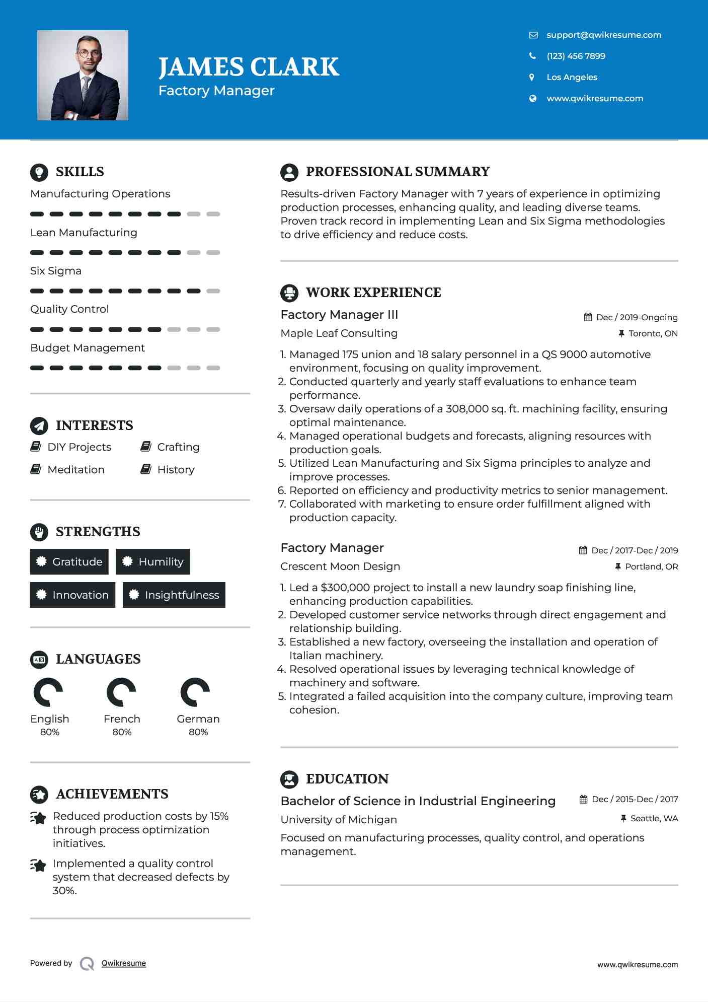 Summary : Results-driven Factory Manager with over 10 years of experience in optimizing production processes, enhancing quality control, and leading cross-functional teams to achieve operational excellence and cost efficiency.