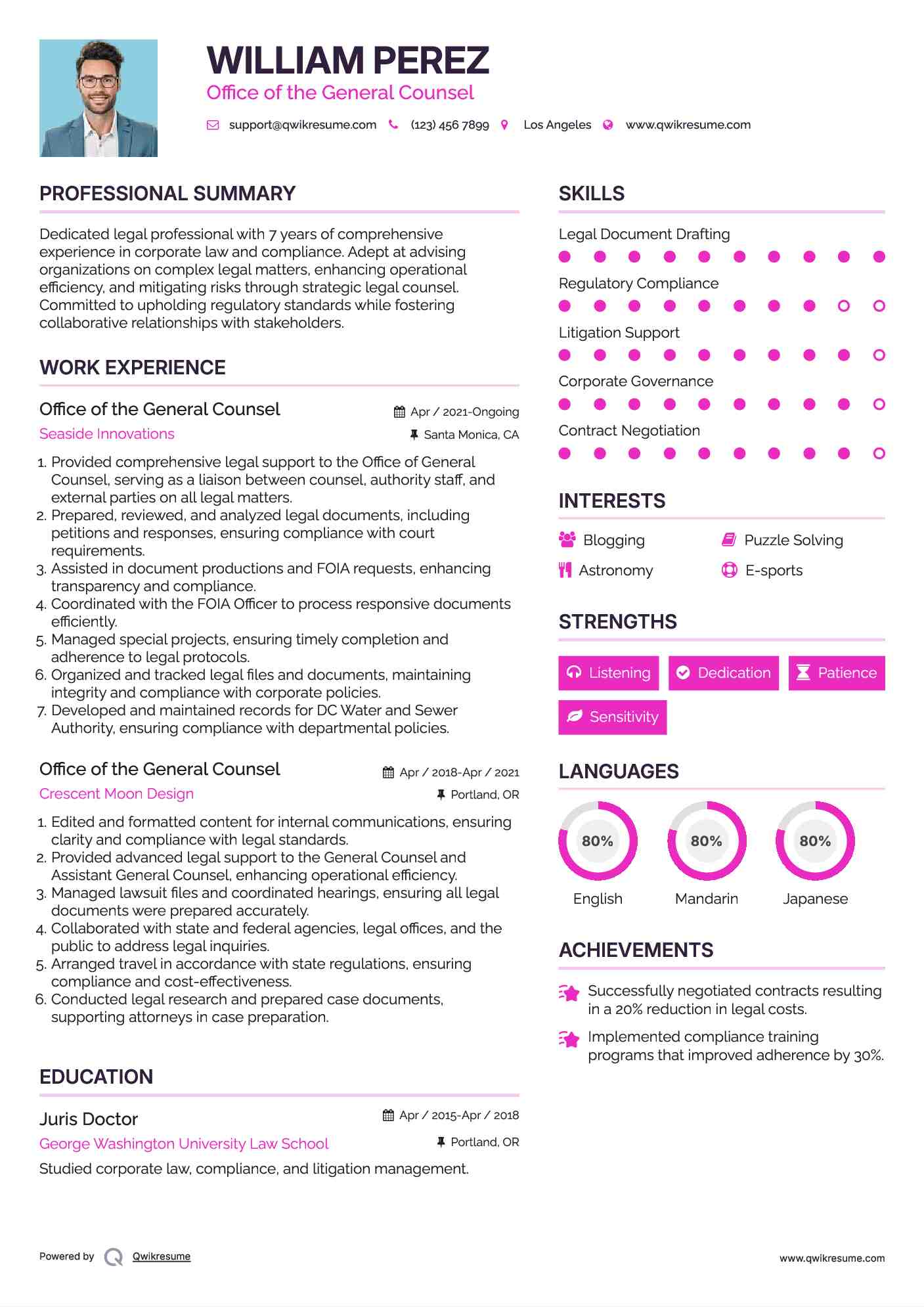 Summary : Results-driven General Counsel with over 10 years of experience in corporate law, compliance, and risk management. Proven track record in leading legal strategies, negotiating complex agreements, and ensuring regulatory compliance.