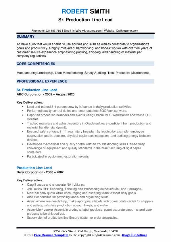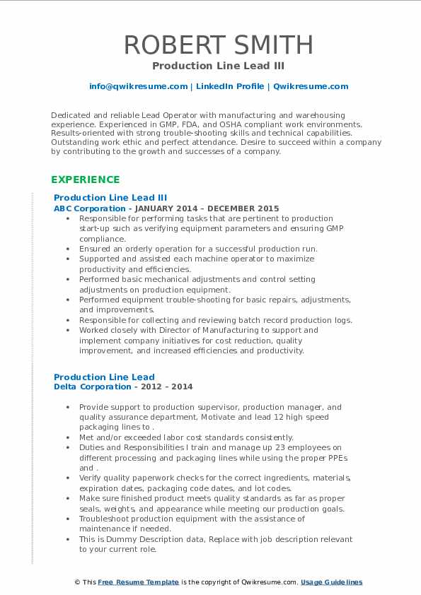 The Production Line Leader oversees the manufacturing activities. A professional Production Line Leader Resume mentions the following duties and tasks – directing assembly line workers, taking responsibility for maximizing quality and productivity, completing paperwork and associated administrative work, updating records, setting up production lines, identifying production line issues, enforcing regulations, enforcing safety compliance among employees and completing work orders efficiently.