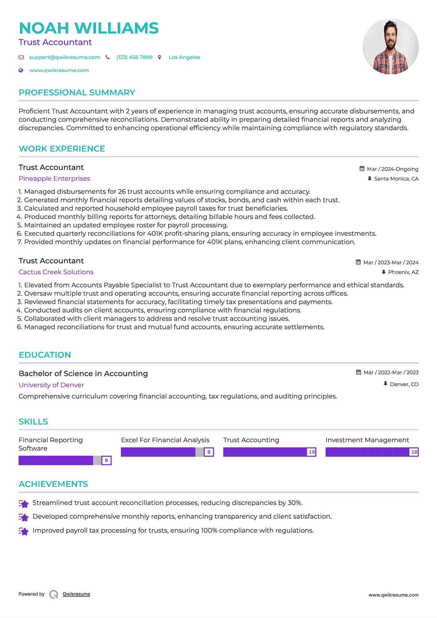 Headline : Seasoned Lead Trust Accountant with 7 years of experience in overseeing trust fund management, ensuring compliance with regulatory standards, and delivering precise financial reporting. Expertise in conducting detailed reconciliations and optimizing operational processes. Proven track record in enhancing trust account performance and fostering strong client relationships.